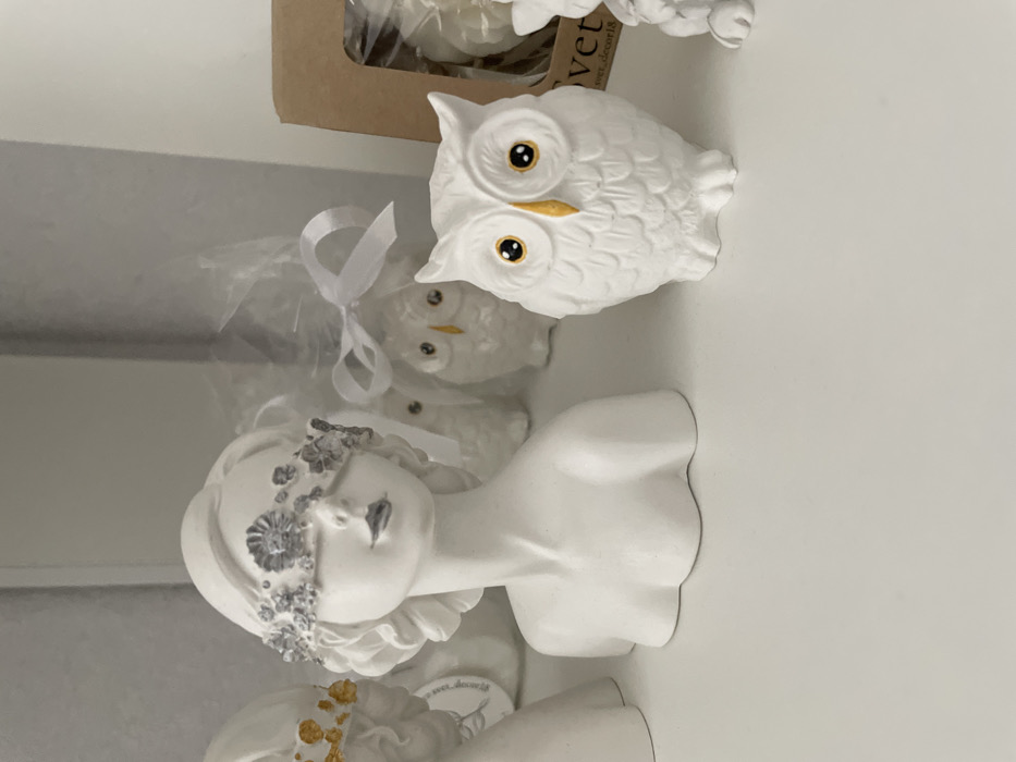 The scene depicts a collection of white decorative figurines displayed on a clean white surface in Izhevsk, Russia. In the foreground, a white bust of a woman is centered, featuring a silver floral band obscuring her eyes and light gray lips. To her immediate right stands a white owl figurine with prominent black and yellow eyes and a yellow beak. Partially visible to the left is another white female bust, adorned with gold floral details over her eyes. In the background, several smaller white owl figurines are individually packaged in clear plastic bags tied with white ribbons. A brown cardboard box with a transparent window, containing additional white objects and displaying partial branding text "ovet_decor&", is visible on the far right. The overall environment appears to be an indoor setting with uniform white walls or shelving. No people are visible.