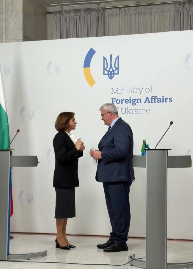 Two individuals, a woman, and a man, exchange a small item, possibly a gift, in front of a backdrop displaying the Ukrainian Ministry of Foreign Affairs logo. The woman is dressed in a black suit and skirt, while the man wears a blue suit with a tie. Both are smiling and appear to be engaged in a cordial interaction. Two podiums are flanking them on either side, with what appear to be flags of Bulgaria and Ukraine. The setting suggests an official event or meeting.