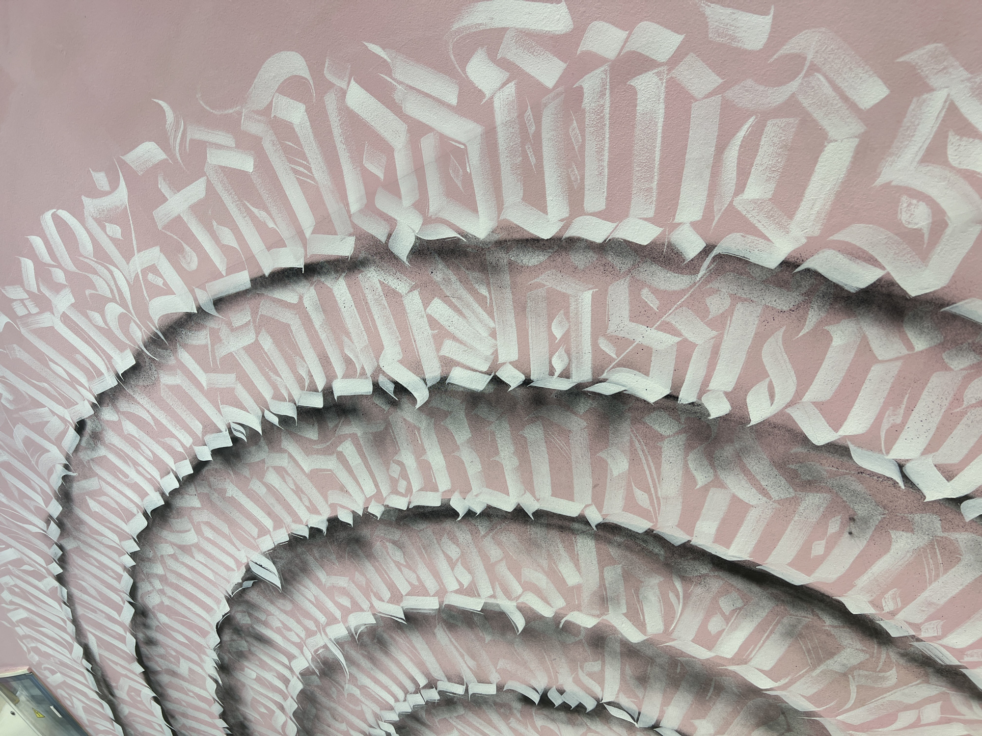 section of a pink wall adorned with abstract white and gray gothic-style calligraphy