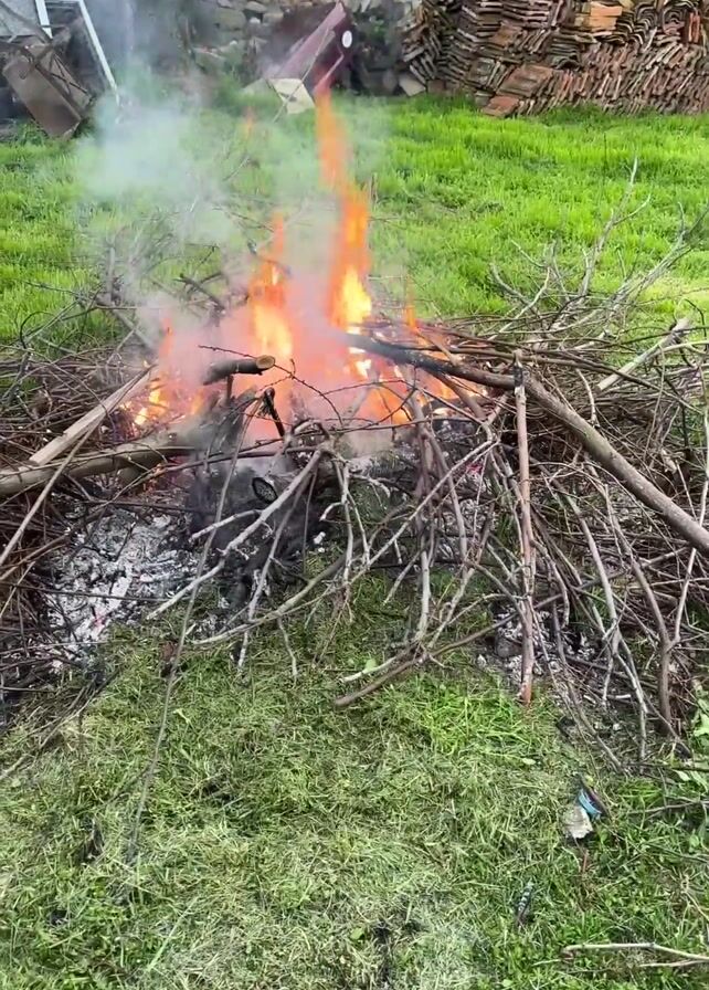 In an outdoor setting, a bonfire burns on a patch of green grass. The fire is fueled by branches and twigs. Smoke billows upward from the flames. In the background, there is a brick wall, a pile of tiles, and some miscellaneous objects. The video is taken at a medium distance, providing a clear view of the fire and its surroundings. There's speaking in the background, but the sound is not clear enough to interpret.