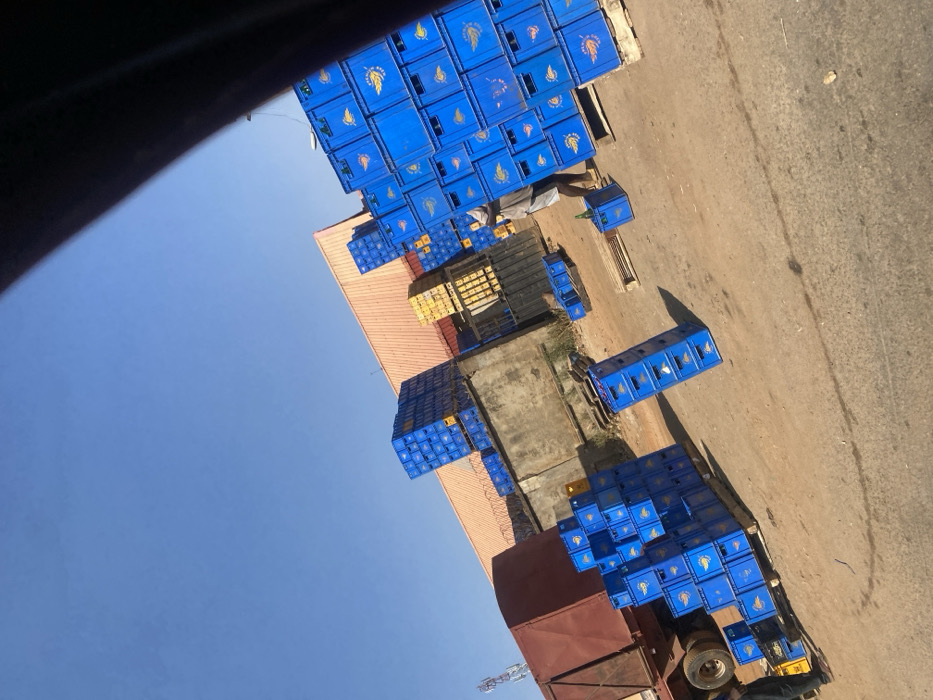 The scene depicts an outdoor storage or distribution area in Sabon Tasha, Nigeria, under a clear blue sky. Numerous stacks of blue plastic crates, predominantly filled with glass bottles, are arranged across a dirt and asphalt ground. Many blue crates feature a yellow winged logo. In the background, a large building with a reddish-orange corrugated metal roof is visible, behind a concrete wall topped with barbed wire, where additional blue and yellow crates are stacked. A large brown cargo truck is parked on the far left. Two individuals are present: one person, dressed in a light-colored shirt and dark shorts, stands near a tall stack of blue crates on the right, with a green bottle resting on a lower crate nearby; another person, partially visible on the far left near the truck, wears dark clothing. Several empty wooden pallets are scattered on the ground. The image is captured at an angle, with a dark obstruction in the upper right quadrant.