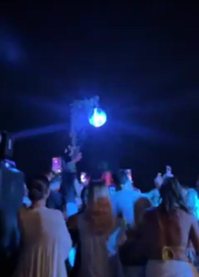 A crowd of people are dancing at night, illuminated by colored spotlights and the light reflecting off a disco ball. Many people are holding up their phones, seemingly to record the event. The background is dark, suggesting an outdoor setting. A speaker sits on the left of the frame.