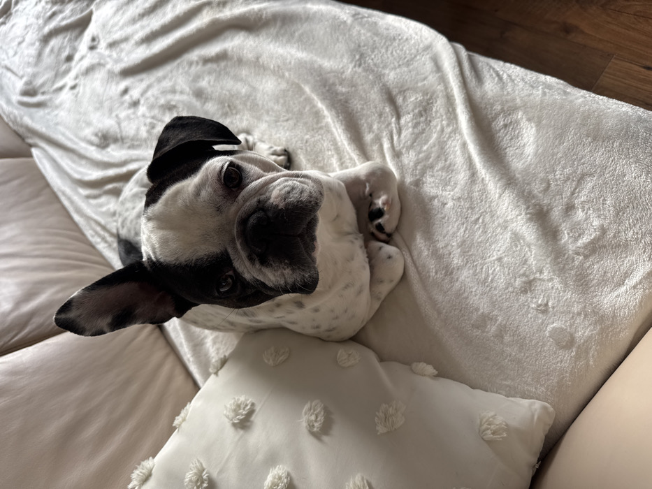 - "A black and white French Bulldog with a spotted white body lies on a light-colored, plush blanket draped over a beige upholstered couch" by FM-uEVzD3, licensed under CC BY 4.0