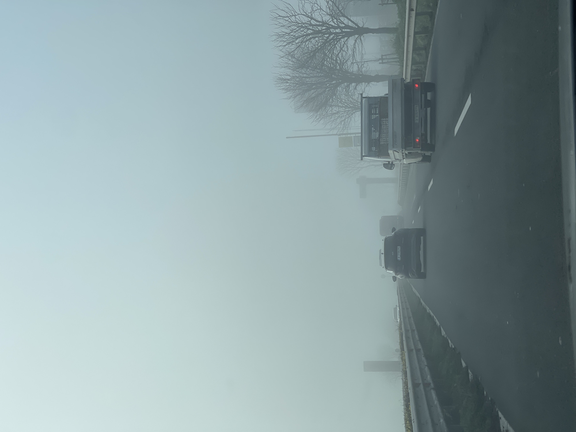 highway scene in foggy conditions. A truck and multiple cars are visible on the road. Trees with bare branches line the side of the highway. The location is presumed to be near Burgas, Bulgaria.