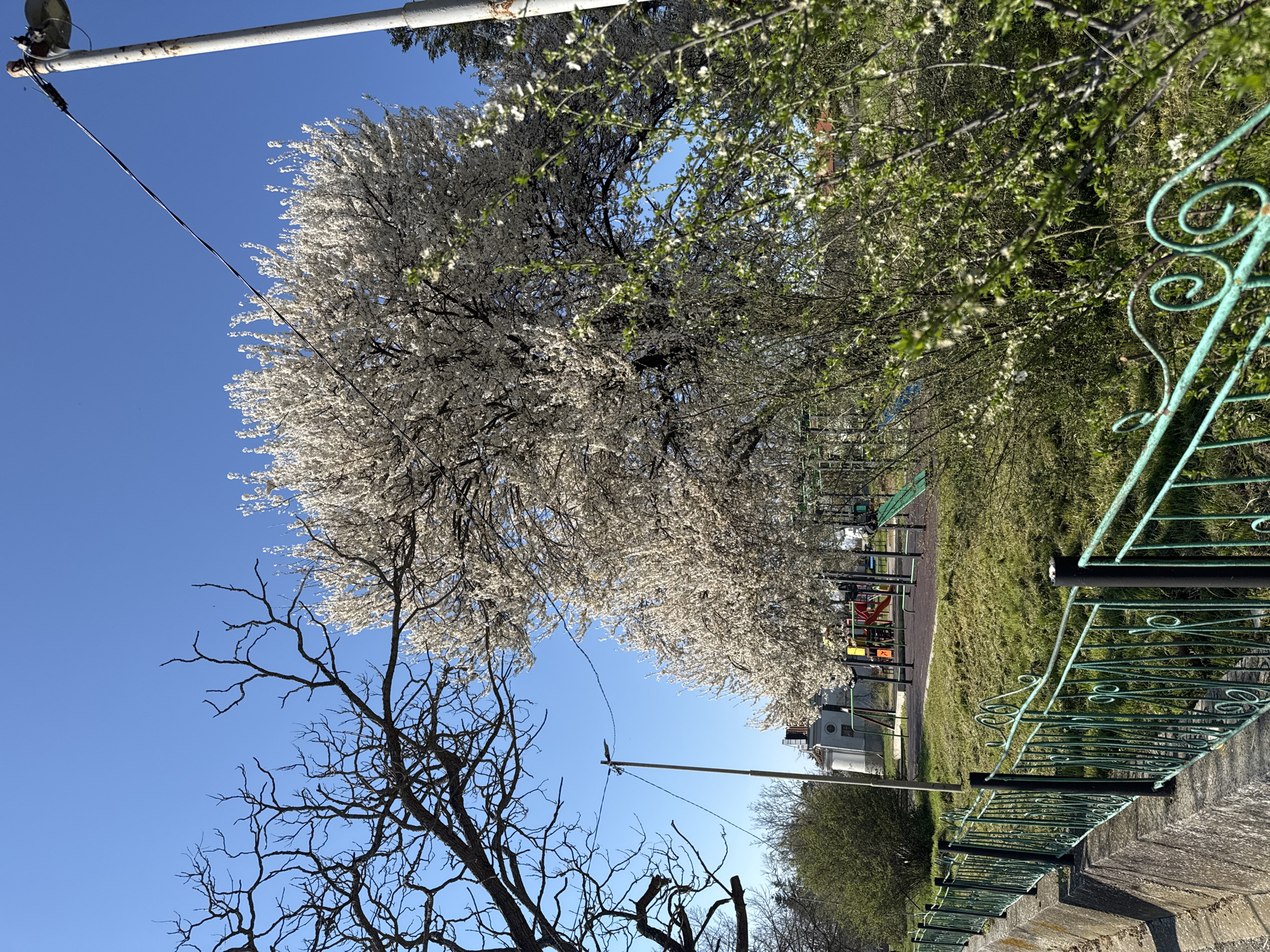 playground in Konstantinovo, Bulgaria, viewed from behind a green metal fence. The sky is clear and blue. A large tree with white blossoms dominates the scene. There's a bare tree with dark branches in the lower-left. A light pole with wires extends from the top of the image. In the background is a building with a round window. The playground equipment is colorful and includes slides and climbing structures. The grass is green and well-maintained.