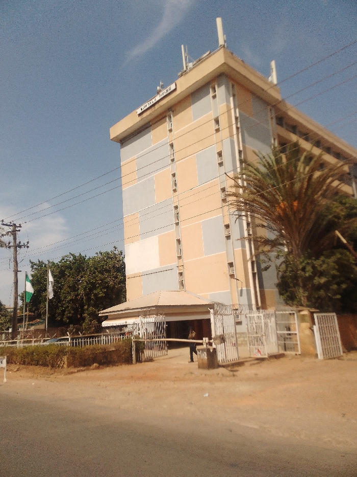 The image displays Murtala House, a multi-story building situated in Jos, Plateau State, Nigeria, under a clear blue sky