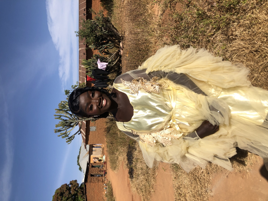 The image displays an adult female standing outdoors in Kerang, Nigeria. She has dark skin, dark hair styled with waves, and is smiling directly at the viewer. She is wearing a light yellow gown, characterized by a shiny main fabric, voluminous ruffled sheer material on the sleeves and skirt, golden-tan floral appliqués on the upper bodice, and a matching waist tie. The background shows a dry, open area with sparse ground vegetation and dirt. To the left, a dirt path leads to multiple single-story residential structures constructed from reddish-brown mud bricks and topped with corrugated metal roofs. A large, leafy green tree stands on the far left. To the right, additional similar structures are visible behind two tall, multi-stemmed cactus-like plants. Various articles of clothing, including red, black, and pink garments, are hanging on a line or bush between these plants. The sky above is clear blue with minimal scattered white clouds, indicating bright daylight conditions.