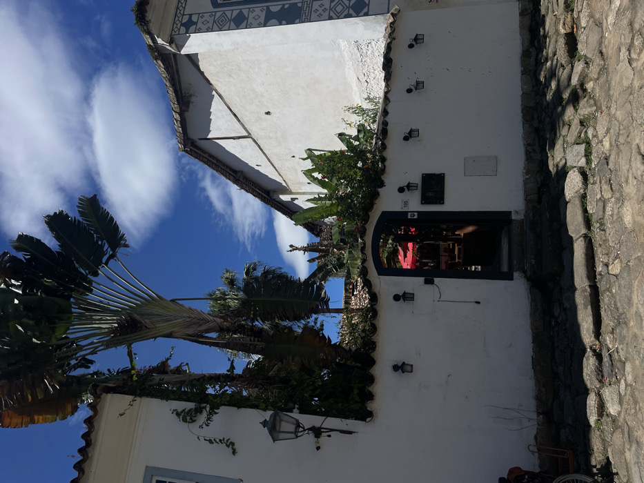 This image depicts a sunlit cobblestone street scene in Paraty, Brazil. The foreground features an uneven cobblestone street with varying shadows. A low, white-washed stone wall with a reddish-brown tiled cap runs horizontally across the midground. The wall has a dark arched doorway in the center, revealing red umbrellas and seating within, suggesting an outdoor dining area. Above the doorway, the house number "195" is visible on the wall, alongside a dark rectangular plaque. Six identical black lantern-style lamps are mounted on the white wall: two to the left of the door and four to the right. To the left of the wall, a tall, multi-stemmed Traveler's Palm (Ravenala madagascariensis) with large, fan-shaped fronds dominates the left side of the frame, growing alongside a white colonial-style building with a brown tiled roof and a visible window frame. Lush green vegetation, including banana-like leaves and other plants, spills over the top of the white wall and partially obscures structures behind it. To the right of the wall and doorway, a large, two-story white building with a distinctive blue and white geometric patterned vertical strip on its far right corner stands under the bright blue sky. This building also has a visible section of a brown tiled roofline. The sky above is a clear blue with scattered white, cumulus-like clouds. No individuals or explicit actions are discernible within the frame, apart from the implied presence of a business behind the arched entrance. A partial view of a wheeled object, possibly a cart or bicycle, is visible on the far left edge of the image.