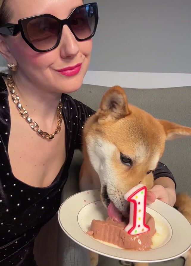 A woman wearing sunglasses, a black studded dress, and a gold chain sits on a gray couch and smiles, holding a plate with a food cake, a candle shaped like the number "1" inserted in it. A Shiba Inu dog next to her eats the cake off of the plate.