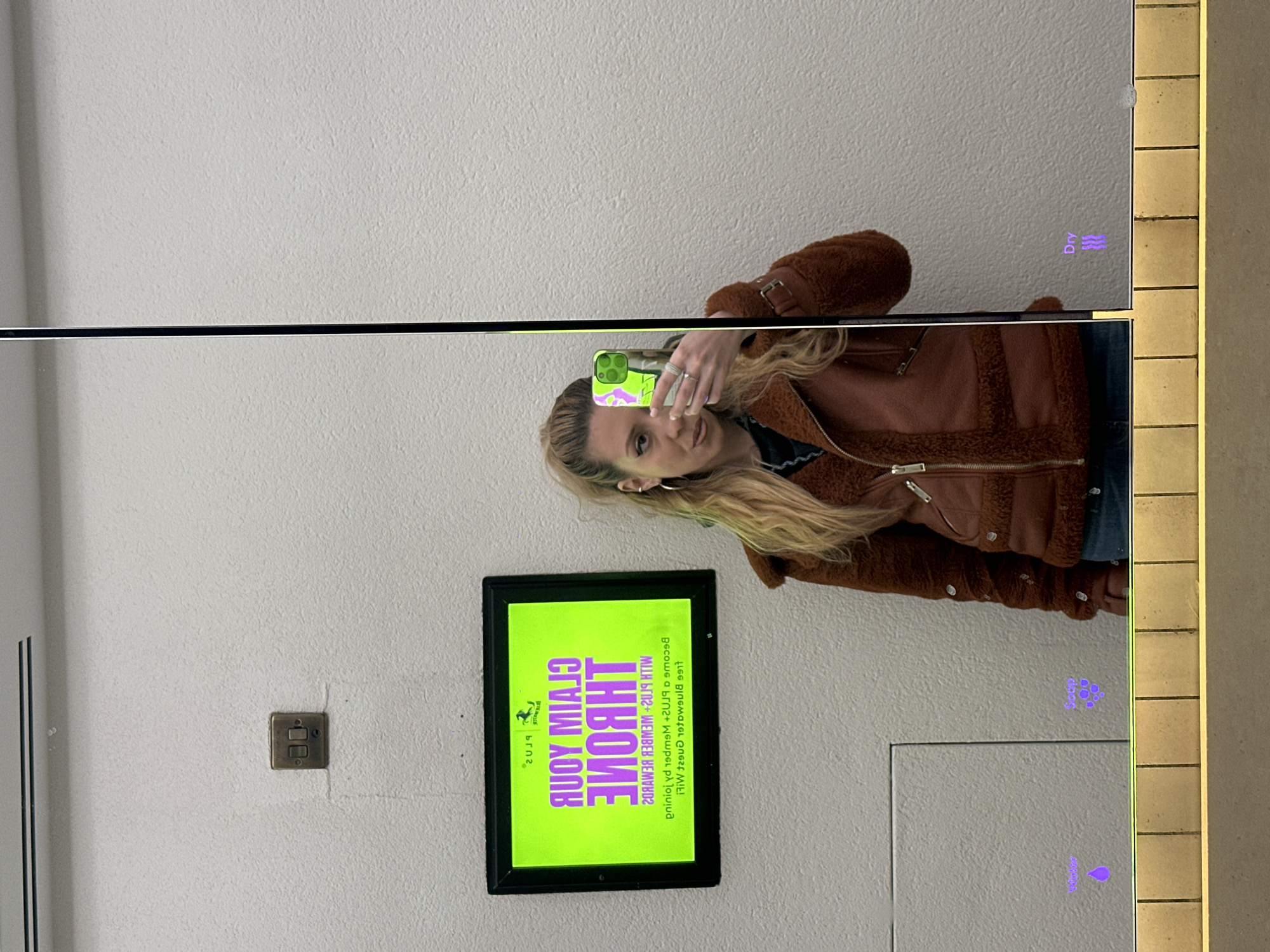 The image depicts a woman taking a selfie in a bathroom mirror. She is wearing a brown jacket with a furry collar and has blonde hair. In the mirror, there is a small green screen displaying a text in reverse saying "CLAIM YOUR THRONE". The wall is painted white with a light switch and indicator icons for the restroom amenities along the side. The location is likely a bathroom facility. There is no information about the city of Dartford, United Kingdom, in the image.