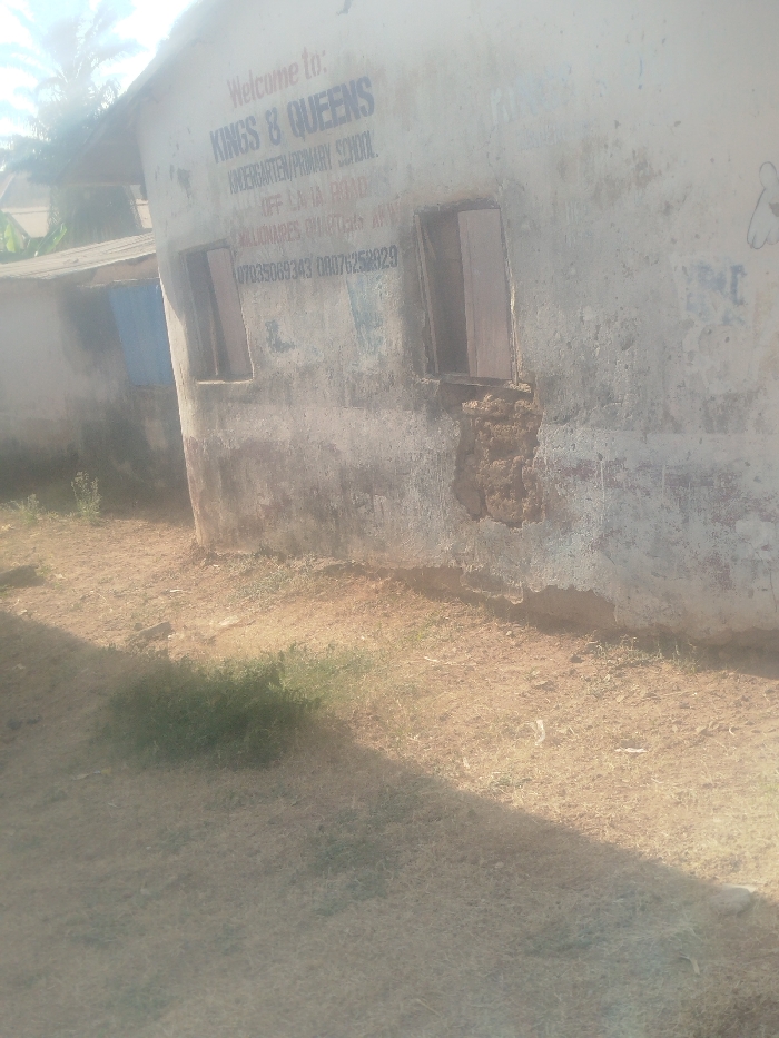 The image displays the exterior of a weathered, single-story building identified as "Kings & Queens Kindergarten/Primary School