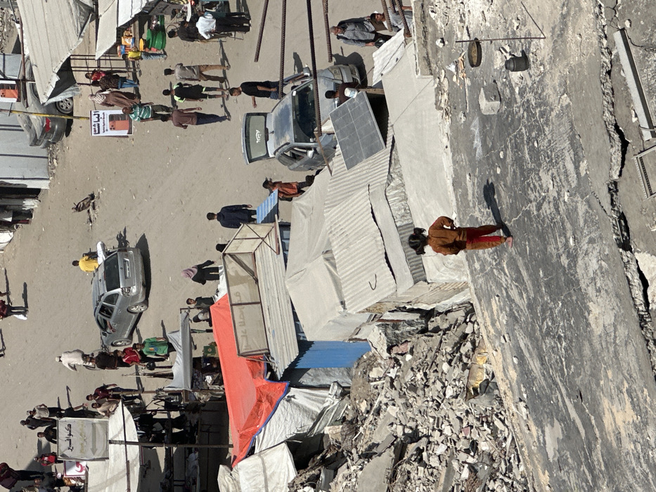 The image presents an elevated, high-angle view of a bustling street scene adjacent to a heavily damaged area in Khan Yunis, Palestinian Territory