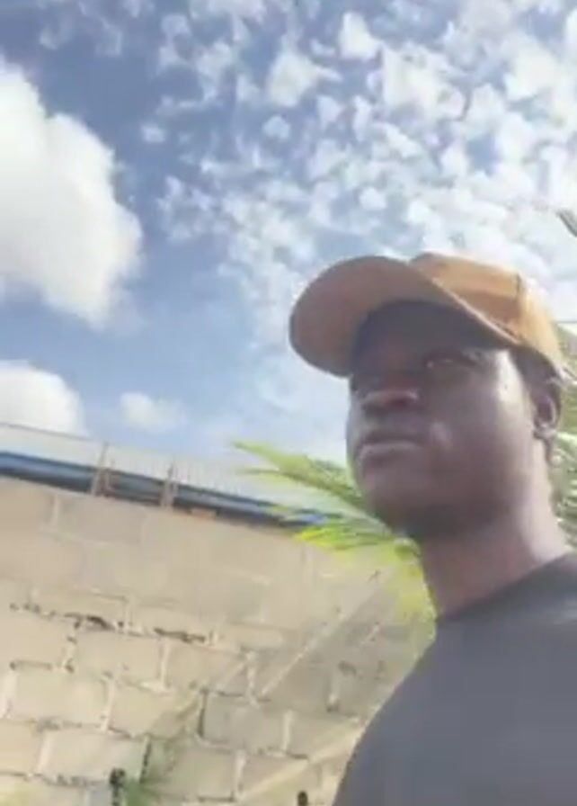 A man is recording a video outdoors. He is wearing a black t-shirt and a tan baseball cap. He is standing in front of a cinder block wall with some greenery in front of it. There is a palm tree visible next to him. The sky is blue with puffy white clouds. The man speaks directly to the camera, saying "Now. Now there is no tomorrow. Do it now."