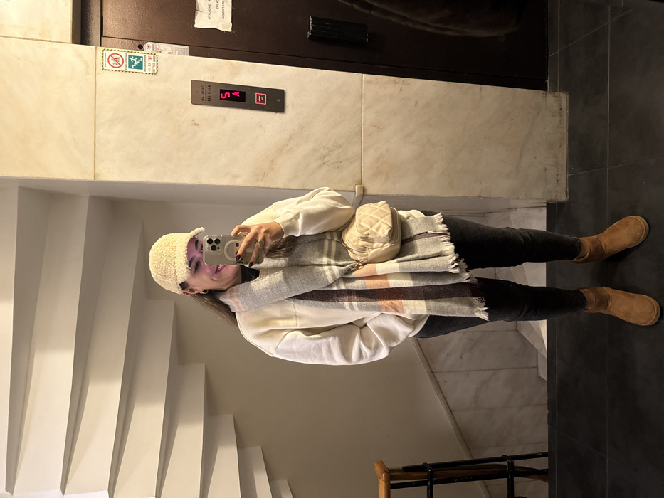 A woman takes a selfie in front of a mirror. She wears a beige fleece cap, a white sweatshirt, a fringed plaid scarf, black jeans, and brown boots. A small beige quilted bag is slung over her shoulder. The background shows stairs on one side and an elevator panel indicating the 5th floor on the other. The floor is dark, and the lighting appears artificial.