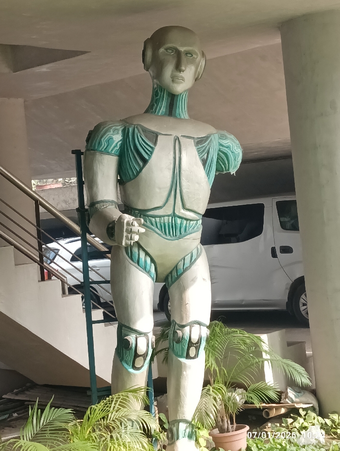 A large, humanoid robot statue stands indoors