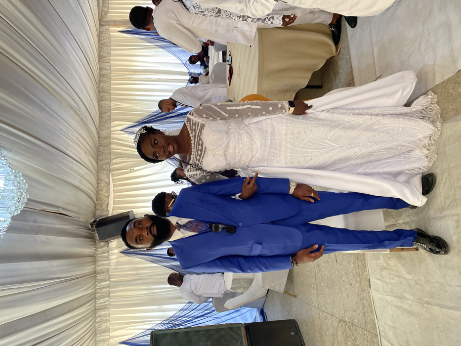 The image depicts an indoor event space, likely a reception hall, with a man and a woman positioned centrally in the foreground. The specific city location of New Stadium, Nigeria is not discernible from the visual evidence. The man, on the left, has dark skin, a dark beard, and is wearing a royal blue two-piece suit over a white shirt and a patterned tie. Sunglasses are hooked onto his left lapel. He wears a dark bracelet and a gold-colored watch on his left wrist, and a ring on his left ring finger. His shoes are black patent leather. His right arm is linked with the woman's left arm. He looks directly forward with a neutral expression. The woman, on the right, has dark skin and is wearing a white, floor-length wedding gown with intricate sequin or beadwork on the bodice and skirt, featuring long sheer sleeves and an opaque white overlay flowing from the waist. She has a decorative hairpiece (tiara-like) in her dark hair and white dangling earrings. A gold-colored watch is visible on her left wrist. Her mouth is slightly open, and she looks slightly to her right (viewer's left). In the background, several individuals are visible, out of focus. Most appear to be adults, some dressed in white traditional attire, others in suits. Some are seated at rectangular tables draped with light beige tablecloths, while others stand. The tables are accompanied by white chairs, some with decorative backs. The environment features a ceiling draped extensively with white fabric, from which a multi-tiered crystal chandelier hangs. The walls are also draped with white fabric, interspersed with vertical panels of royal blue fabric providing a decorative accent. A large, dark speaker box is visible on the far left. The floor is a light-colored, possibly tiled or polished concrete surface. The lighting appears even and artificial.
