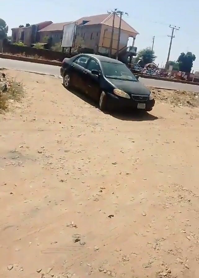 A dark-colored sedan is parked off the side of a paved road on a dirt surface