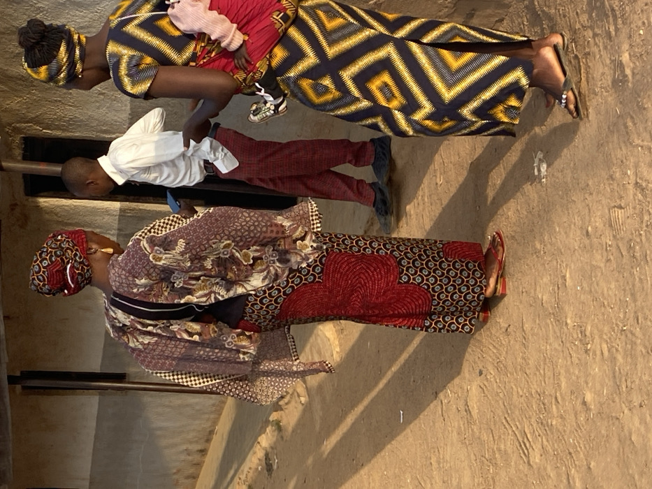 A photograph captures three people standing on what appears to be a paved surface. A woman wears a patterned dress with a red and brown design and a matching headscarf. Beside her stands a man in a white shirt and maroon trousers, looking down. A second woman, wearing a navy blue and yellow geometric-patterned dress and head covering, holds a child dressed in red and white. All are wearing footwear.