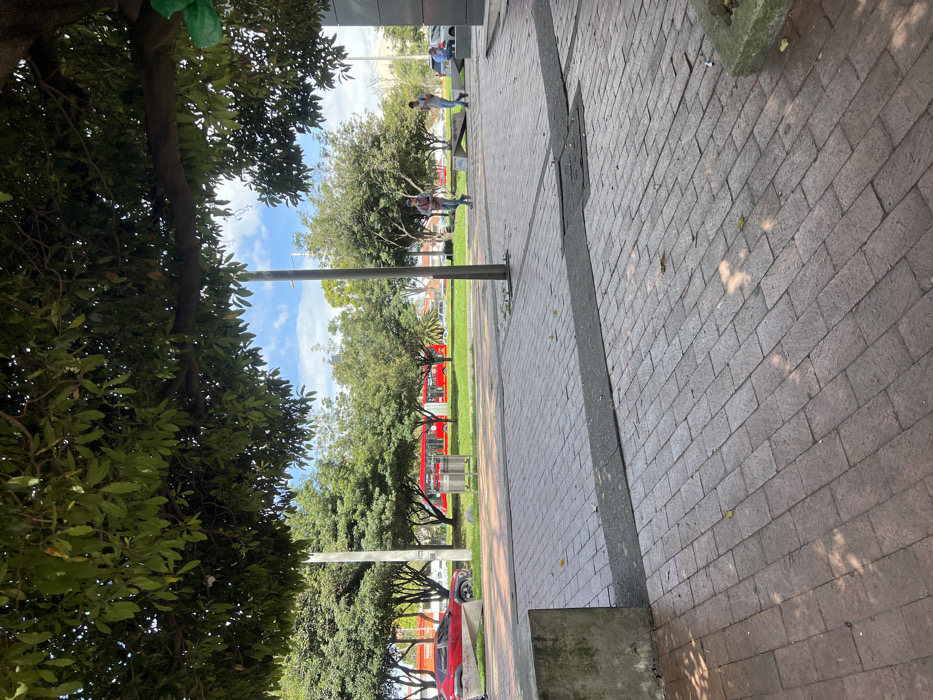 A diagonal view of a brick-paved sidewalk bordered by trees. A metal pole stands tall along the sidewalk's edge. Beyond the trees, a glimpse of red transit buses is seen. People stroll along the sidewalk in the distance. The sky peeks through the foliage, hinting at a sunny day. Some leaves are visible on a big tree on the left.