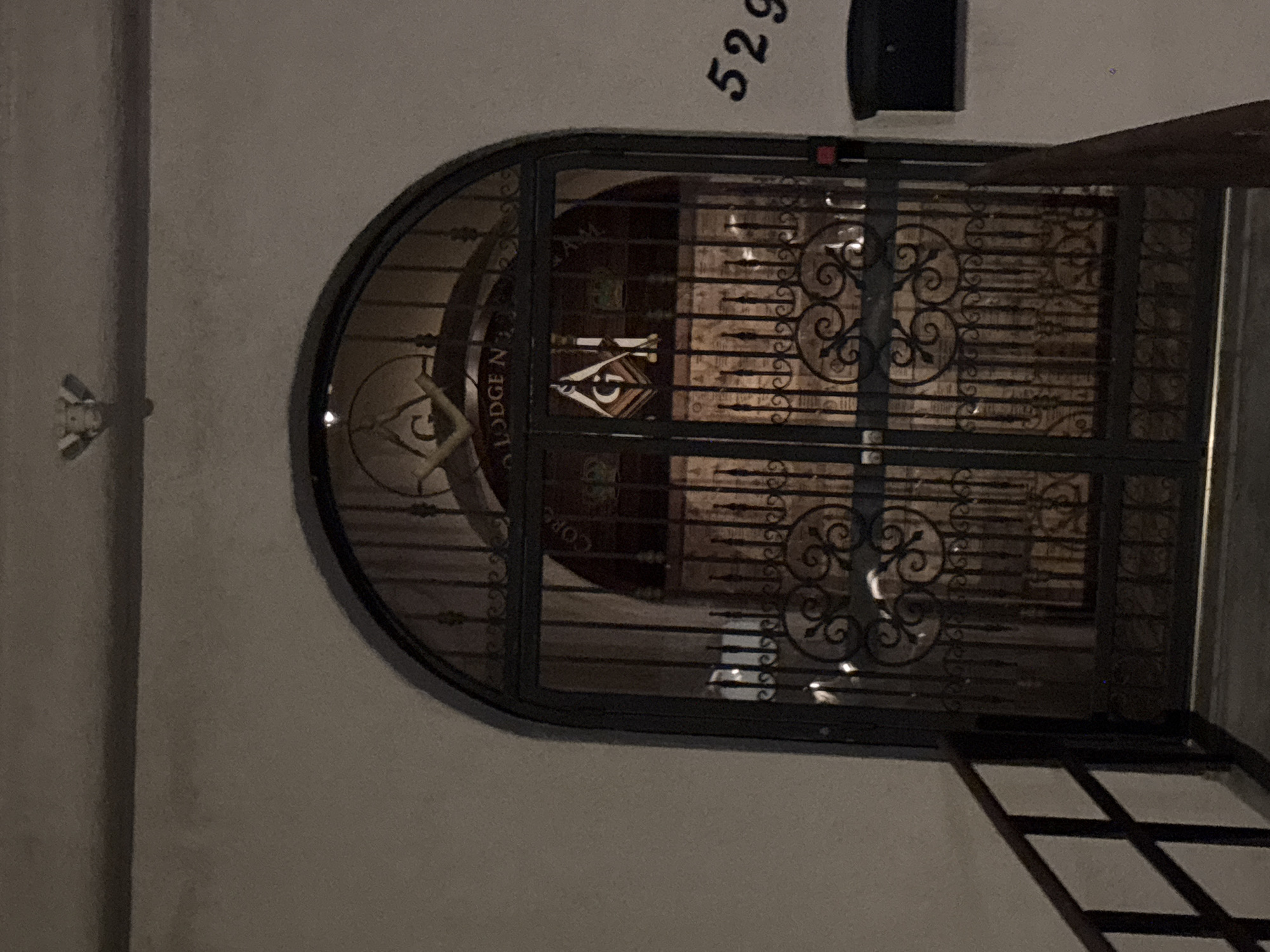 The image depicts the Coronado Lodge N° 441 building, located at 529 Orange Ave, Coronado, California, United States of America. The main focus is on the arched iron gate protecting the entrance. The Masonic symbol, a square and compass, is visible on the front door behind the gate. A decorative light fixture is mounted on the wall to the left of the entrance. A section of a metal grid walkway is visible in the bottom right corner of the image.