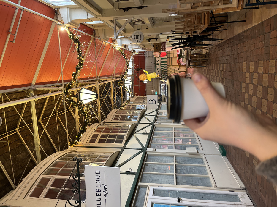 The image captures an indoor passage within Oxford's Covered Market, United Kingdom
