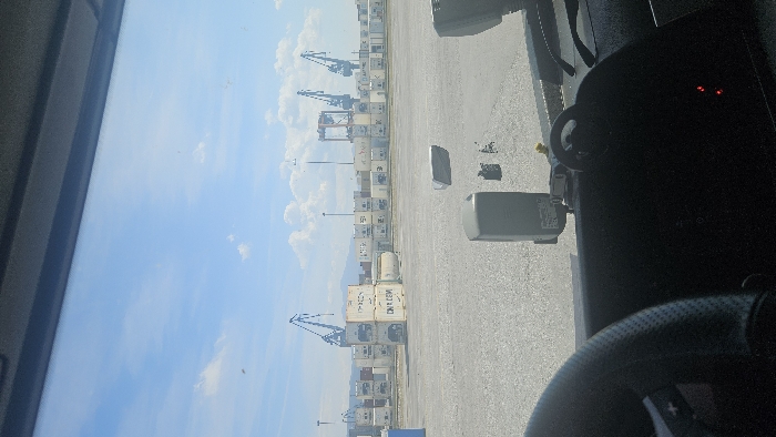 The image depicts an exterior view of a commercial port container terminal, observed from within a vehicle