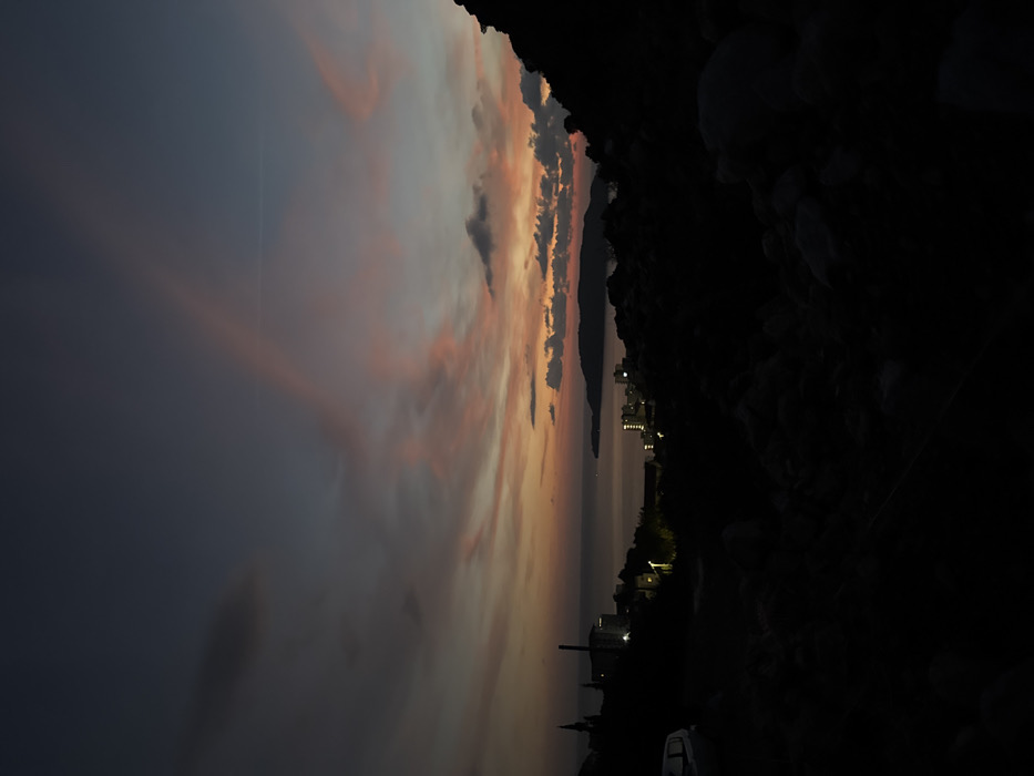 The image displays an elevated panoramic view of the coastal town of Rafailovići, Montenegro, at dusk. The sky, occupying the upper two-thirds of the frame, transitions from deep indigo and dark grey overhead to shades of orange, pink, and red along the horizon, illuminated by the setting sun. Scattered clouds, some dark and some reflecting the sunset colors, are present. Below the sky, a calm body of water, identified as the Adriatic Sea, stretches across the mid-ground, appearing dark and slightly reflective. The immediate foreground is heavily shadowed, revealing an uneven terrain of dark rocks and debris. A light-colored vehicle, possibly a car or van, is partially visible in the lower-left portion of this shadowed foreground. Along the coastline in the mid-ground, the town of Rafailovići is visible, characterized by clusters of buildings with numerous illuminated windows and distinct streetlights. A tall, slender industrial-type structure, resembling a smokestack or tower, is prominent on the left side of the town's buildings, alongside structures with pointed rooflines. In the distance, a large, dark landmass, likely an island or peninsula, is silhouetted against the horizon, defining the far side of the bay. No individuals are visible.