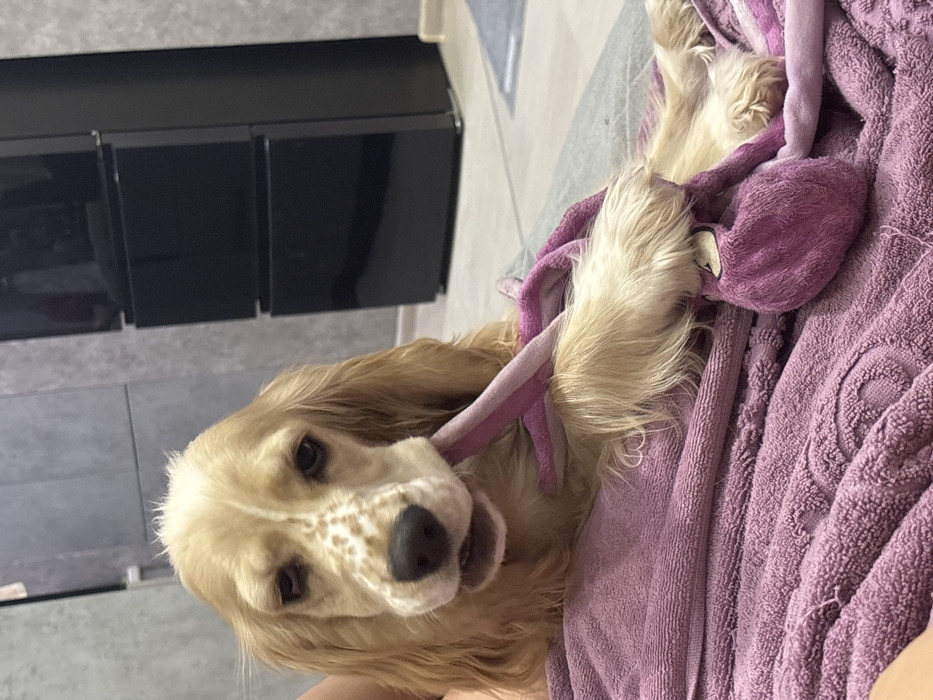 - "A cocker spaniel with tan fur and brown eyes is wrapped in a thick, lavender-colored towel" by FM-ARrGE2, licensed under CC BY 4.0