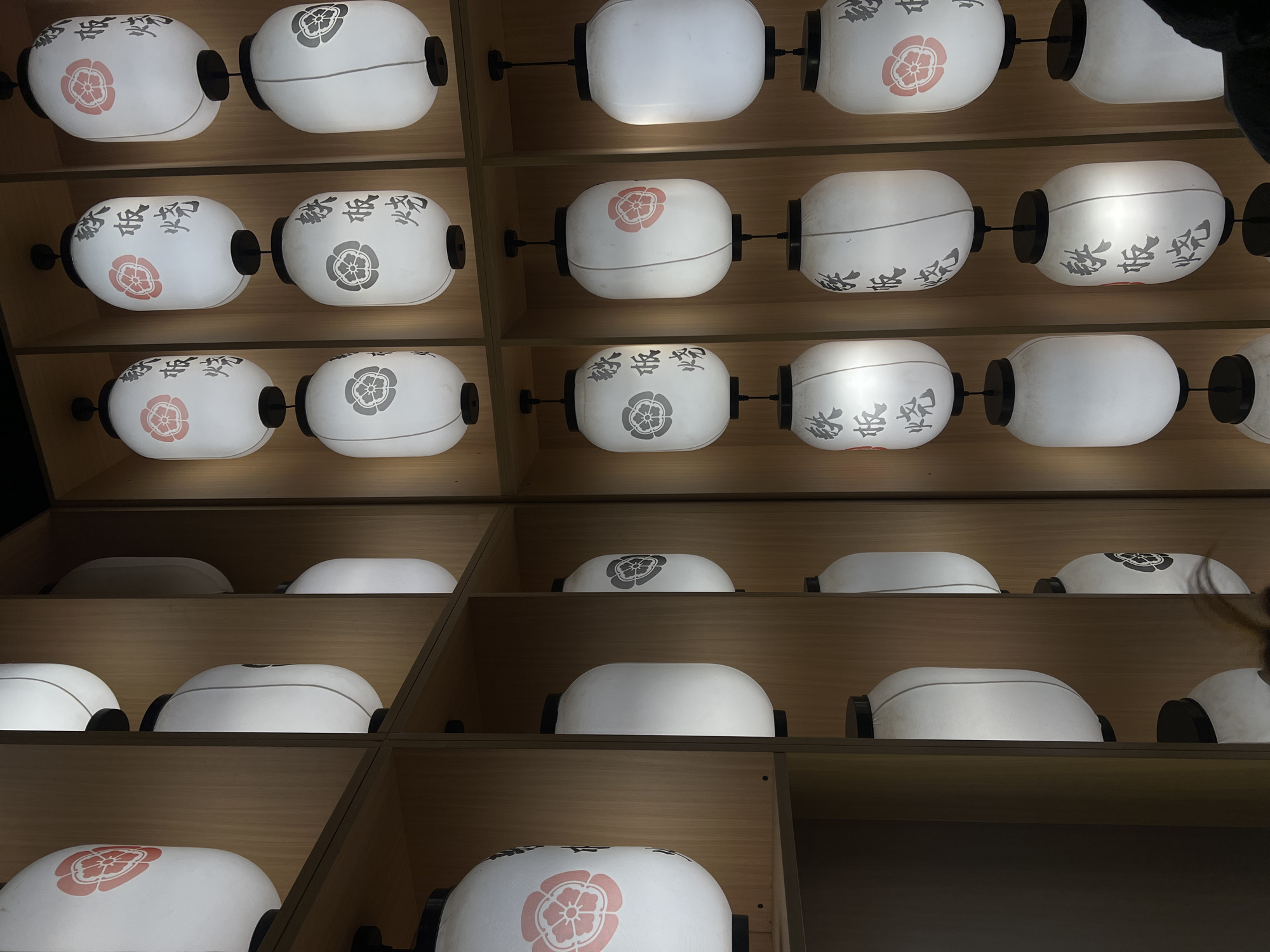 The image displays an indoor wall decorated with numerous illuminated Japanese paper lanterns, known as chochin, arranged in a grid pattern