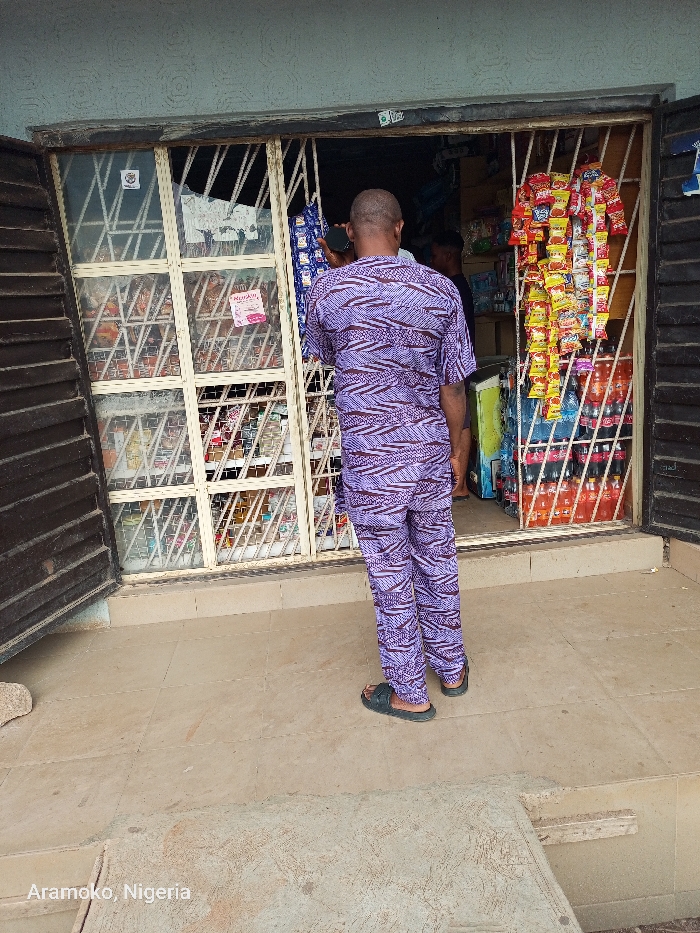 man wearing a purple and brown patterned shirt and pants standing in front of a store with a metal grate door. The store is located at coordinates (latitude: 7.839, longitude: 4.484) in Ilobu, Nigeria. Inside the store, shelves are stocked with various goods, including bags of chips, bottles of soda, and other items. Another person is partially visible in the background. The sidewalk in front of the store is made of tan-colored concrete tiles.