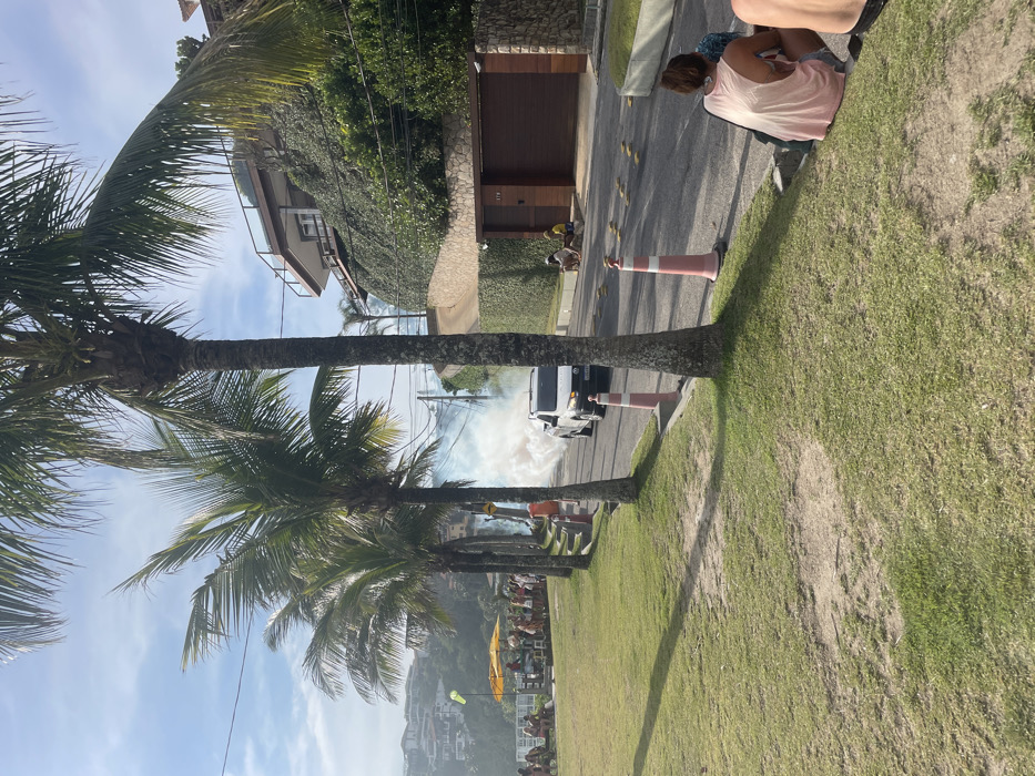 Palm trees line a grassy area beside a street. A white vehicle, obscured by smoke, is positioned on the road between two orange and white safety cones. People sit on the grass edge. A building with a brown door and foliage-covered wall stands adjacent to the street. Houses are visible in the distance under a cloudy sky.