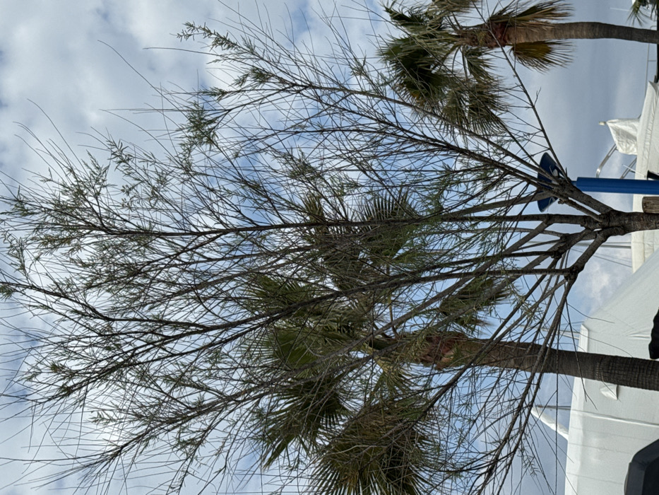 The image displays an outdoor scene within the marina area of Port D'andratx, Spain. A semi-deciduous tree with a dense network of thin, dark brown branches and sparse green foliage dominates the central and left portions of the foreground. Behind this tree, two palm trees with brown trunks and green fronds are visible, one positioned left-center and the other to the right. The upper background consists of a partially overcast sky with white clouds and blue patches. In the lower mid-ground, below the tree canopy, multiple white tarpaulins covering docked boats or yachts are present. A segment of a vertical blue pole with a dark, disc-shaped top is partially visible behind the central foreground tree, towards the right. No individuals, actions, or specific interactions are depicted.