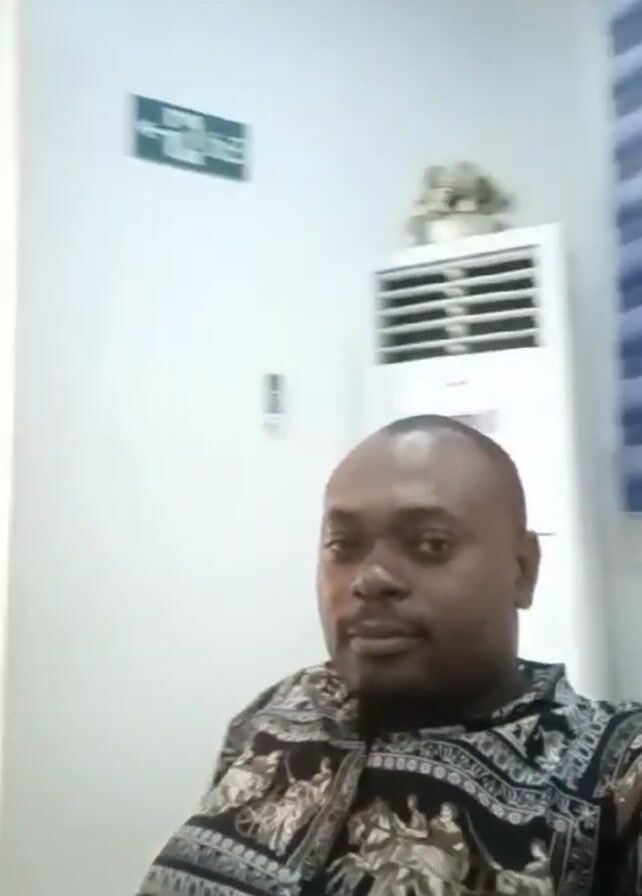 A man is recording a selfie video in an office setting. He is wearing a black patterned shirt. He looks directly at the camera. In the background, there is an air conditioner, window blinds, and a wall clock. The video appears to be shot indoors.