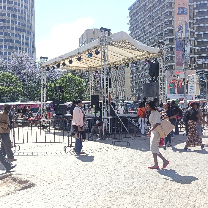 This image depicts an outdoor urban environment in Nairobi, Kenya, specifically at the Tom Mboya Monument area, adjacent to the Kenyatta International Convention Centre (KICC), which is identifiable as the tall, cylindrical building on the far left. The scene is illuminated by bright daylight under a clear sky, casting distinct shadows. A temporary event stage, constructed from metal trussing with a white canopy roof, occupies the midground. Several stage lights, some emitting blue and green illumination, are mounted to the truss structure. Large audio speakers are positioned on and around the stage platform. Black metal crowd control barriers delineate the perimeter of the stage area. In the foreground, the ground is paved with interlocking blocks. A man in a brown jacket is partially visible on the far left, walking towards the right. A woman in a light pink top and dark trousers stands near the barriers, facing right and carrying a dark bag. Further right, a woman in a light-colored dress and red flat shoes walks towards the right, carrying a large beige tote bag. Numerous other individuals are visible standing, walking, and congregating behind the barriers and in the deeper background. Multi-story buildings define the background, including a prominent rectangular structure on the right featuring large commercial billboards, one advertising "GT Bank" and another "MOOV." The bronze statue of Tom Mboya is visible directly behind the stage, partially obscured. Deciduous trees with purple blossoms (Jacaranda) are visible on the left side of the background. Public transport vehicles are present on thoroughfares in the far background. The arrangement of the stage and barriers suggests a public event or gathering.