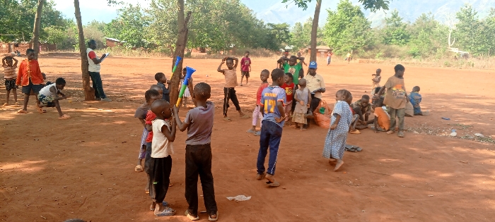 The image depicts an outdoor gathering in Ngalula, Democratic Republic of the Congo, on a reddish-brown dirt ground under daylight conditions