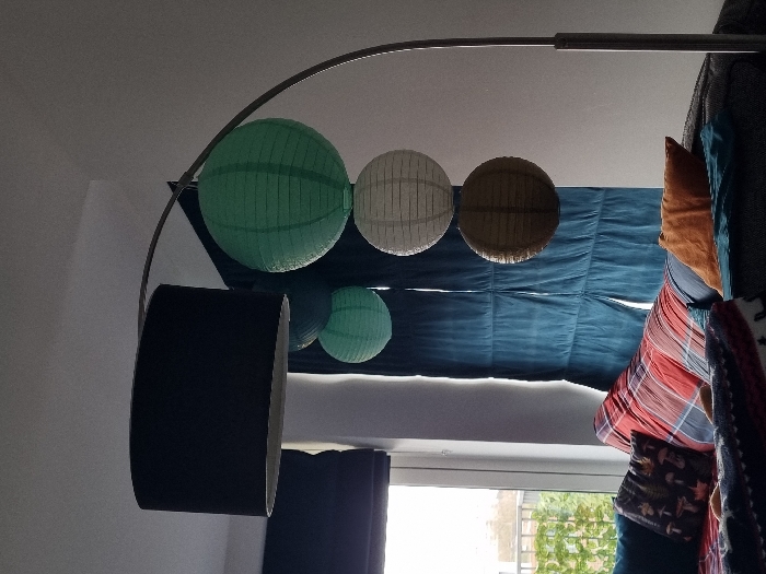 This image captures an indoor living space, likely a living room, bathed in natural light from a window on the left. No individuals are present. **Essential Subjects and Objects:** A prominent silver-toned arc floor lamp, featuring a large, dark grey or black cylindrical drum lampshade, extends from the right foreground towards the center-left. Suspended in the mid-ground, beneath and slightly behind the lamp's arc, are five spherical paper lanterns of varying sizes and colors: one large mint green, one smaller dark teal, one off-white, one brown/tan, and another smaller mint green lantern partially obscured on the far left. In the lower half of the frame, a section of a dark-colored, upholstered sofa is visible. Draped over the sofa is a red and blue plaid throw blanket. Several cushions are arranged on the sofa, including a dark cushion patterned with mushrooms, a solid dark teal cushion, and a solid orange-brown cushion. Another dark, possibly patterned, blanket or throw is visible on the sofa's armrest in the lower-left corner. A large window on the left side of the image reveals green foliage outside, indicating an outdoor area such as a balcony or garden. To the right of the window, dark blue, possibly velvet, pleated curtains with a subtle ombre effect cover a portion of the wall. The interior walls are painted a light, neutral color, and the ceiling is white and flat. **Location:** The specific location within London, United Kingdom, cannot be determined from the available visual evidence.