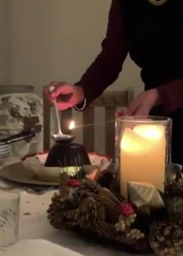 woman in a maroon top and gold necklace, standing by a table, lighting a Christmas pudding with a spoon of flammable liquid