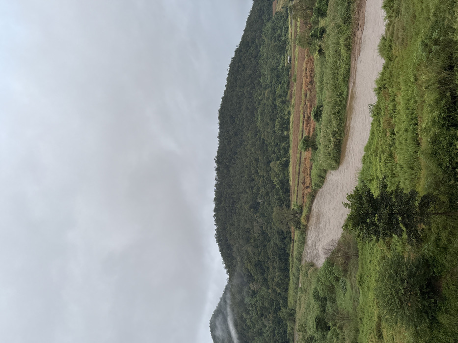 A river flows through a lush, green landscape. On one side, a densely forested mountain rises, its slopes covered in verdant trees. On the opposite bank, a mix of tall grasses and cultivated terraces lines the river's edge. The water is murky and reflects the overcast sky. Mist veils the lower part of the mountain. The scene evokes a remote, natural setting.
