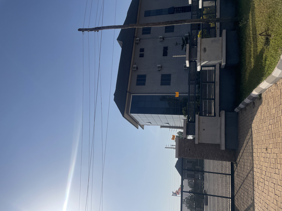 A modern building with a glass-paneled corner stands against a clear blue sky. Several air conditioning units are visible on the exterior walls. A black metal gate guards the property. A grassy area is visible to the right of the building, next to a paved sidewalk with a white and grey curb. Power lines stretch across the sky.