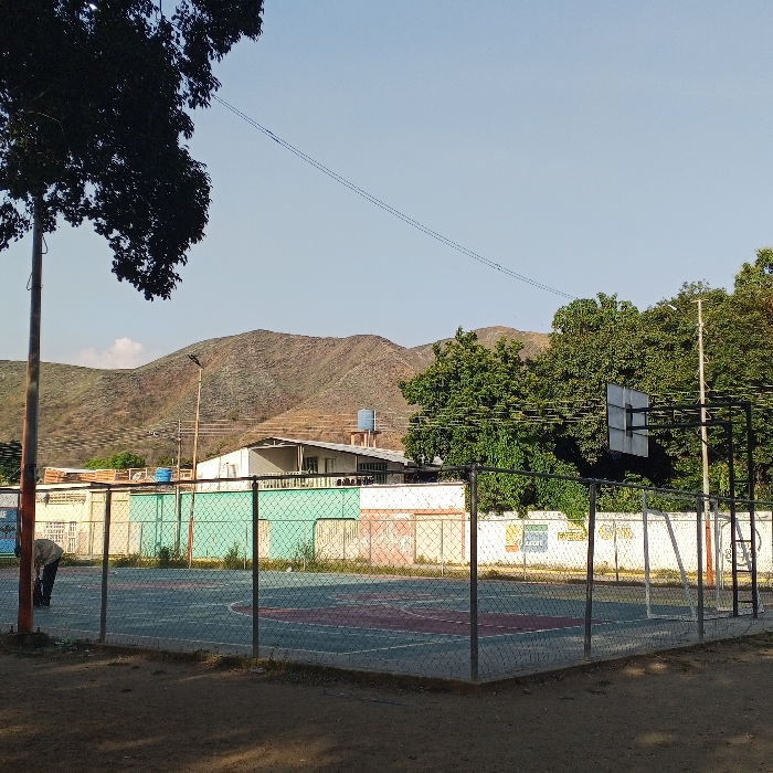 A fenced basketball court sits in an outdoor setting, with a person visible on the left. A building with a turquoise and white fence is behind the court, and trees and mountains are visible in the background. The sky is clear and blue. Overhead wires are also present.