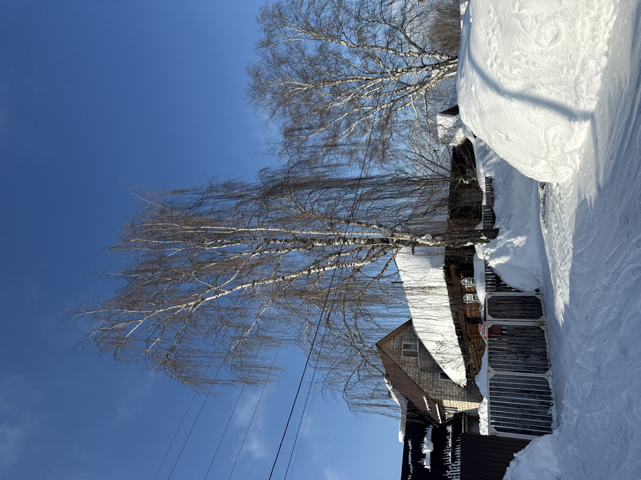 The image displays a winter scene in the city of Zhebrei, Russia, under a clear, bright blue sky. A snow-covered path or driveway, showing faint depressions, occupies the foreground, flanked by substantial snowbanks. A metal and wooden gate, partially buried in snow, leads to a property. Behind the gate are two houses: one on the left with a light-colored upper facade and a brown, snow-covered sloped roof, and another on the right, an older log structure with a dark, heavily snow-laden roof forming a significant overhang. Multiple bare birch trees with white bark and slender, drooping branches are prominent throughout the midground. At least three parallel power lines are visible across the upper left portion of the frame. No individuals are present in the scene.