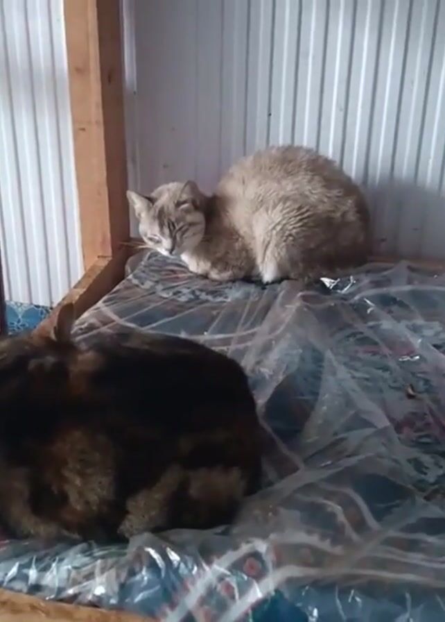 Inside a small, simple room with corrugated metal walls, three cats are resting on a bed covered with a clear plastic sheet over a patterned blanket