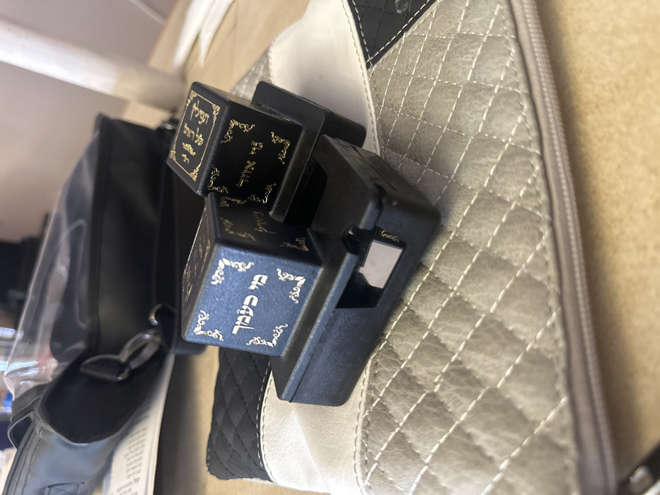 The image displays two black religious articles identified as Tefillin, placed on a multi-paneled pouch