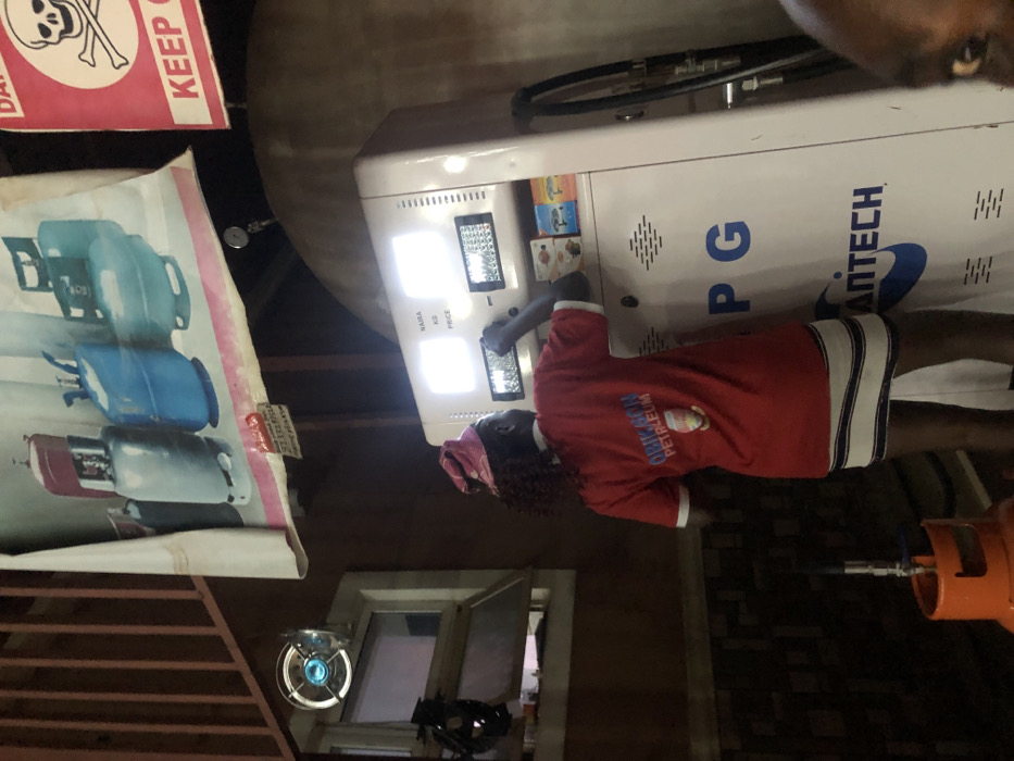 An individual wearing a red shirt and a head covering appears to be operating a gas dispensing machine. The machine, with "PG" and "ANTECH" prominently displayed, has lighted digital readouts for Naira as price. Beside the machine, a poster showcases images of gas cylinders. Above the poster is a red sign with a skull and crossbones, bearing the word "KEEP." Below, a window and a blue-flamed gas burner are visible. A gas tank is connected and in the right corner.
