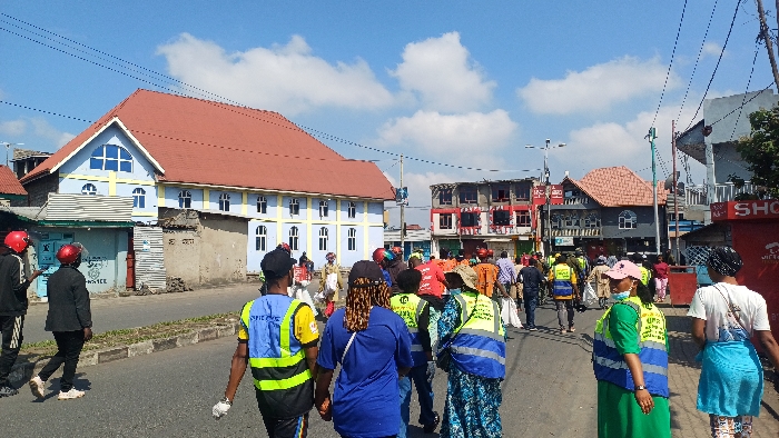 The image depicts a vibrant urban street scene in Gisenyi, Rwanda, under a clear blue sky with scattered clouds. The primary focus is a paved asphalt road occupied by a large group of individuals. On the left side of the street, a distinctive two-story building features light blue walls, yellow trim, and a prominent red gabled roof. Its facade includes multiple arched windows on the lower level and a large, multi-pane arched window on the upper gable. Adjacent to this building are smaller structures, including one with corrugated metal siding. Further down the street, various multi-story buildings are visible on both sides, some appearing residential or commercial, with varied construction and roofing styles. On the far right, a structure with a red base displays "SHOP" lettering and an "Airtel" logo. Overhead, power lines crisscross the scene, supported by utility poles. The majority of the people are walking away from the camera, moving along the street. Many are wearing high-visibility vests; common colors include yellow-green with blue stripes, and solid blue. Several individuals within this group appear to be carrying white bags, suggesting an organized community activity such as a clean-up. On the far left, two individuals wearing dark clothing and red helmets are visible, potentially associated with motorcycles or scooters. The overall scene suggests a busy thoroughfare with ongoing community engagement or daily activity.