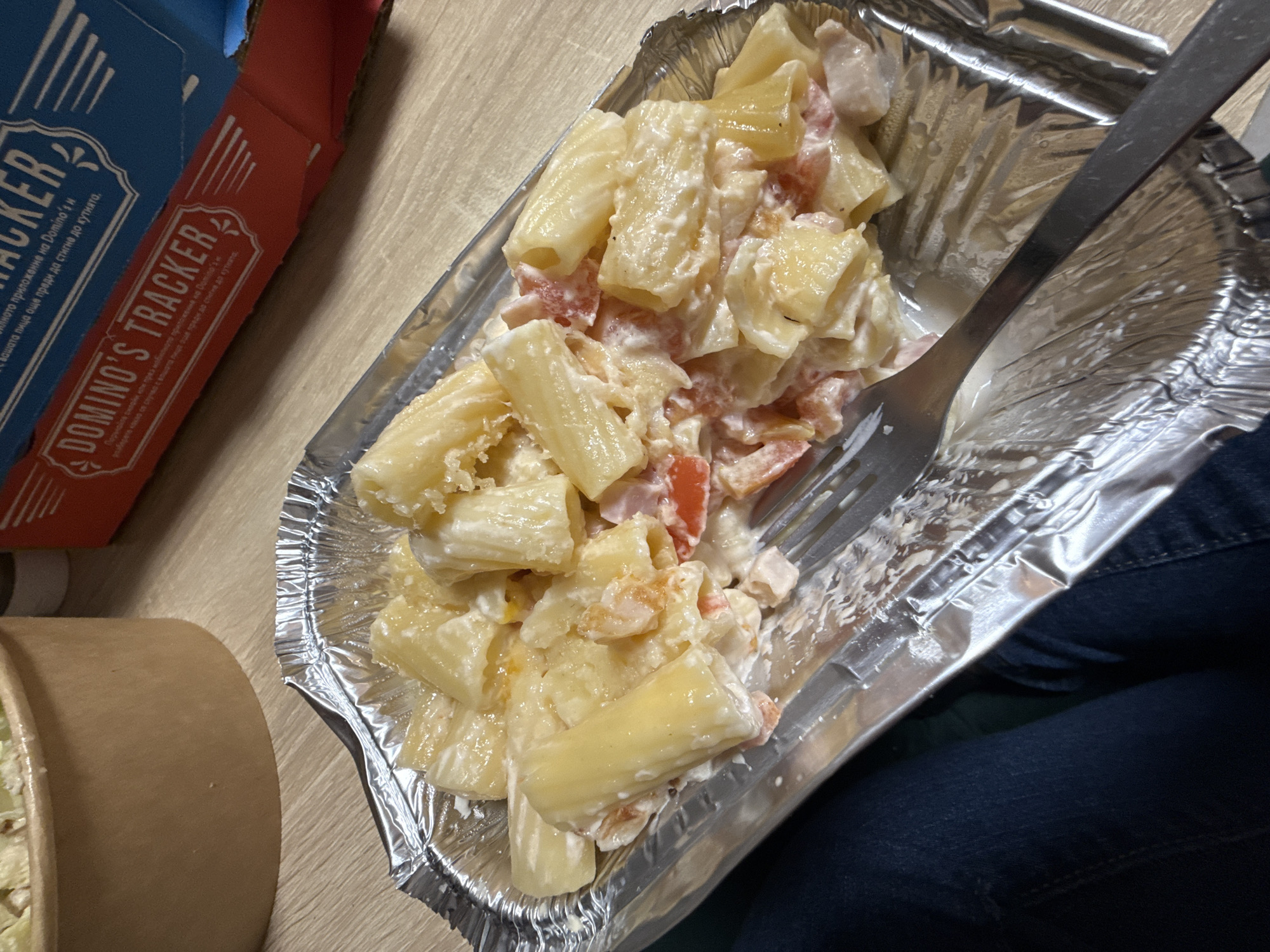 partially consumed aluminum container filled with pasta in a creamy sauce, mixed with what appears to be diced tomatoes and chicken. A metal fork is resting in the pasta. Next to the container is a Domino's Pizza box and a brown paper container. The Domino's Pizza box has text in Bulgarian on it that says, "Domino's Tracker," and indicates the pizza can be tracked online or through the app. The setting appears to be indoors, possibly on a wooden table, with the lower right of the image showing a person wearing denim pants. It can be inferred from the Domino's Tracker on the pizza box that the location is in the city of Sofia, Bulgaria.