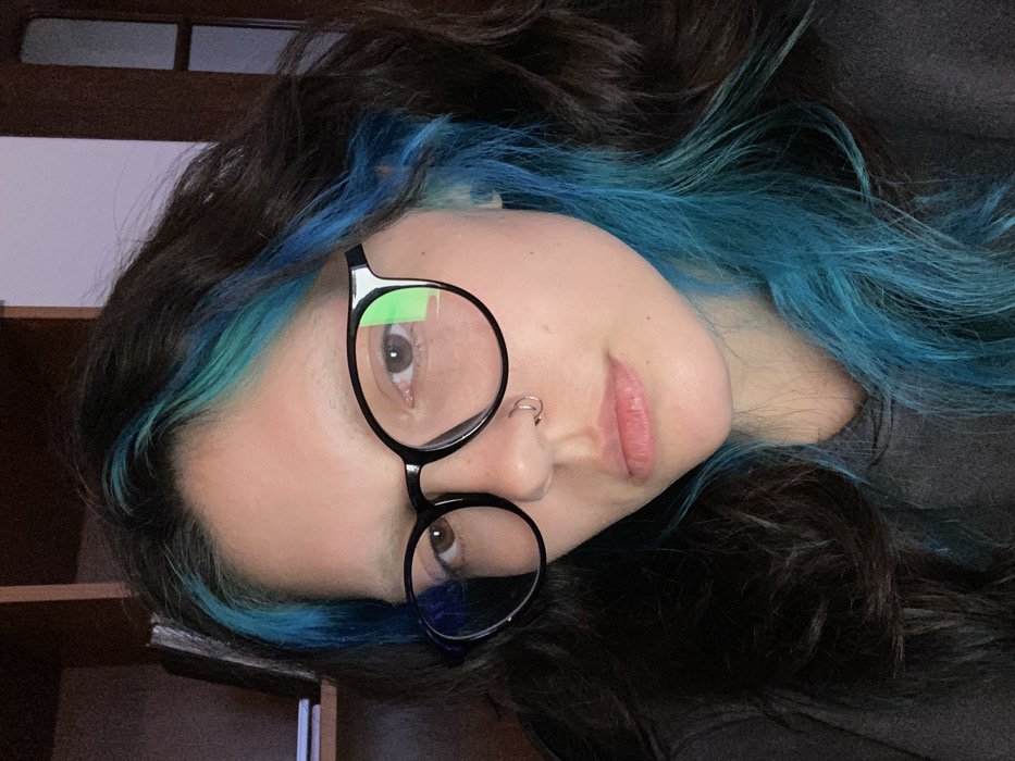 A woman with light skin is pictured from a tilted angle, wearing round, black-framed glasses and a silver nose ring. She has dark brown hair with streaks of teal or turquoise. Her eyes are light brown. She is slightly smiling, and her lips are pink. The background includes a dark gray shirt and what appears to be a dark wooden shelf with vertical dividers. The lighting is soft and seems to come from above.