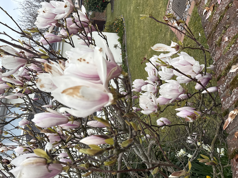 The image depicts a magnolia tree in full bloom, observed from a slightly elevated perspective within a residential garden in Gorleston-on-Sea, United Kingdom. The foreground is dominated by numerous white and pink magnolia blossoms at various stages of opening, some exhibiting brown discoloration on their petals. Bare branches and nascent green leaf buds are interspersed among the flowers. The lower edge of the frame features a moss-covered brick wall with fallen petals. In the midground, a meticulously maintained green lawn stretches across the scene, bordered by a narrow garden bed containing small plants. The background reveals a portion of a white two-story residential dwelling with a dark, tiled roof and multiple windows, some obscured by venetian blinds. A small, dark green evergreen shrub is visible to the right of the house, adjacent to what appears to be a stone-edged drainage grate on a paved surface. The sky is overcast. No individuals are present in the scene.