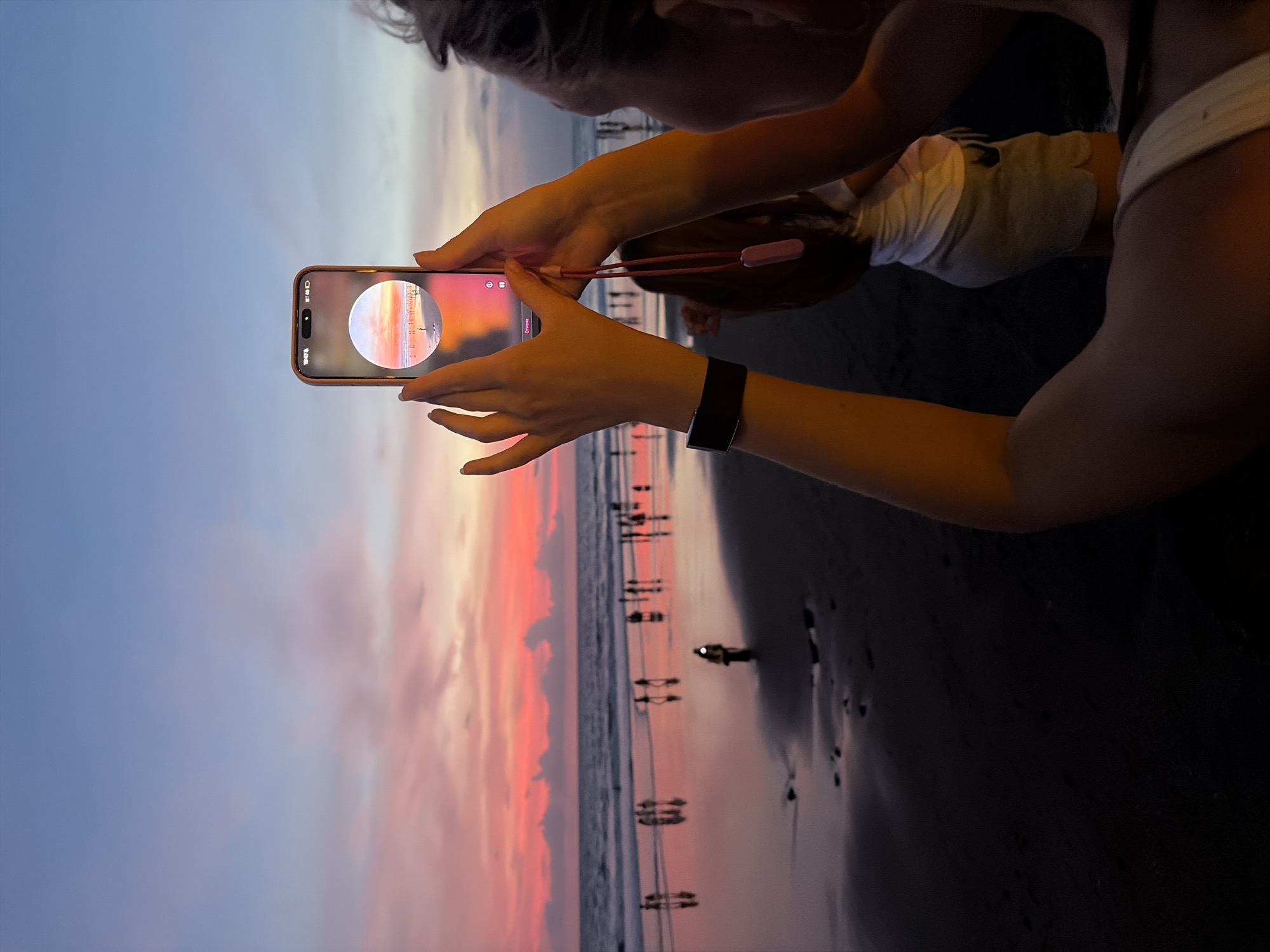The image depicts a sunset scene on a beach in Canggu, Indonesia. In the foreground, a person's arms and shoulders are visible, holding a light-colored smartphone vertically with both hands to capture the view. A black smartwatch is present on the left wrist. The phone's screen displays a circular live preview of the sunset and beach scene, mirroring the background, with an "18:47" timestamp, battery, and signal icons visible. A pink lanyard is attached to the phone and hangs downward. Partially obscured behind the person holding the phone is another individual wearing a white t-shirt and light shorts. The background features a wide expanse of ocean and beach under a dramatic sunset sky. The sky transitions from a deep blue at the top to vibrant pink, orange, and red hues near the horizon, with several dark cloud formations. The ocean has dark, breaking waves reflecting the sky's colors. The wet, dark sand of the beach also reflects the intense red and orange light. Numerous human silhouettes are scattered across the beach, walking or standing near the waterline. One figure on the sand appears to be illuminated or holding a light source.