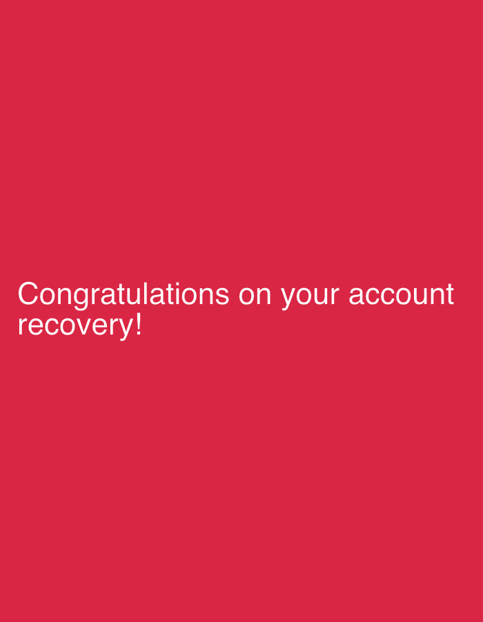 The image displays a congratulatory message. In white font on a red background, it says "Congratulations on your account recovery!" The text is centered horizontally and positioned in the lower half of the image. The color scheme is bold and creates a simple yet celebratory design.
